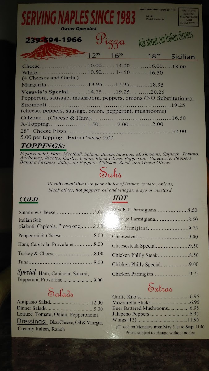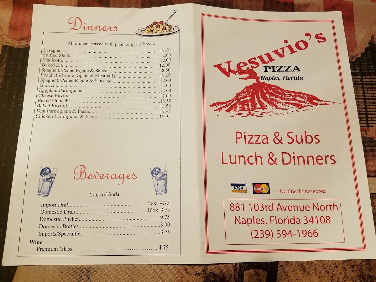Welcome to Vesuvio's Pizza, an Italian gem nestled in Naples, Florida. Known for its mouthwatering selection, the menu features classics like the Cheese Pizza and the flavorful Vesuvio's Special Pizza, loaded with pepperoni, sausage, and veggies. Veggie lovers will enjoy the Vesuvio's Veggie Special Pizza and the delightful Antipasto Salad.